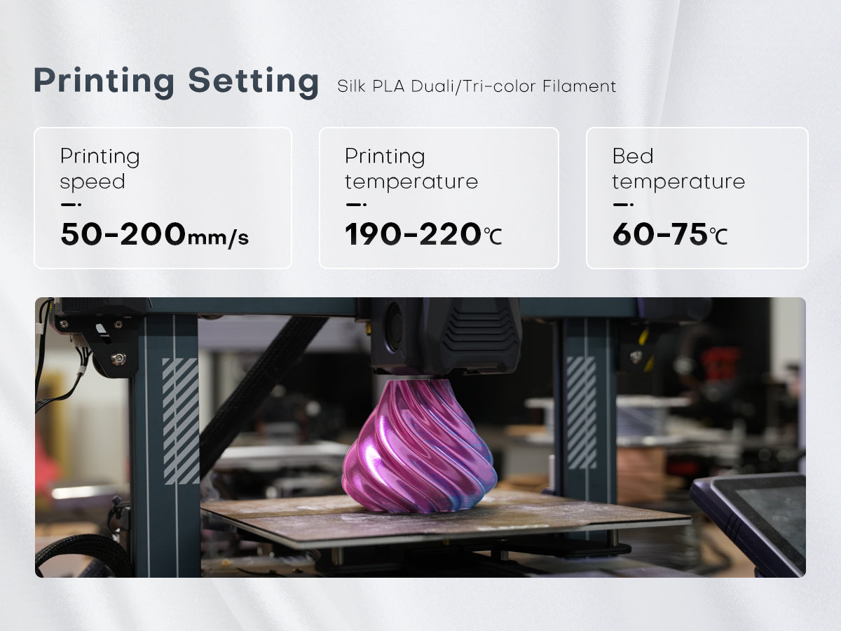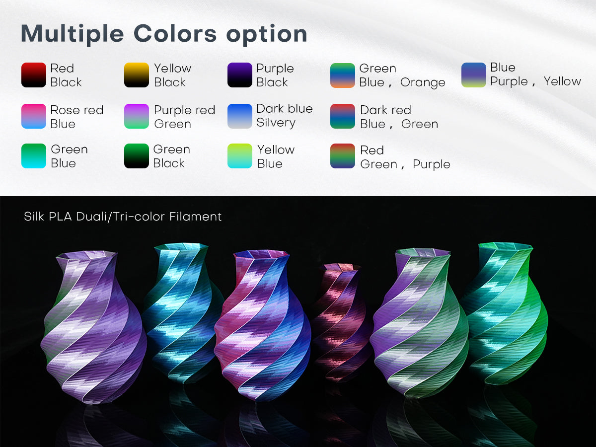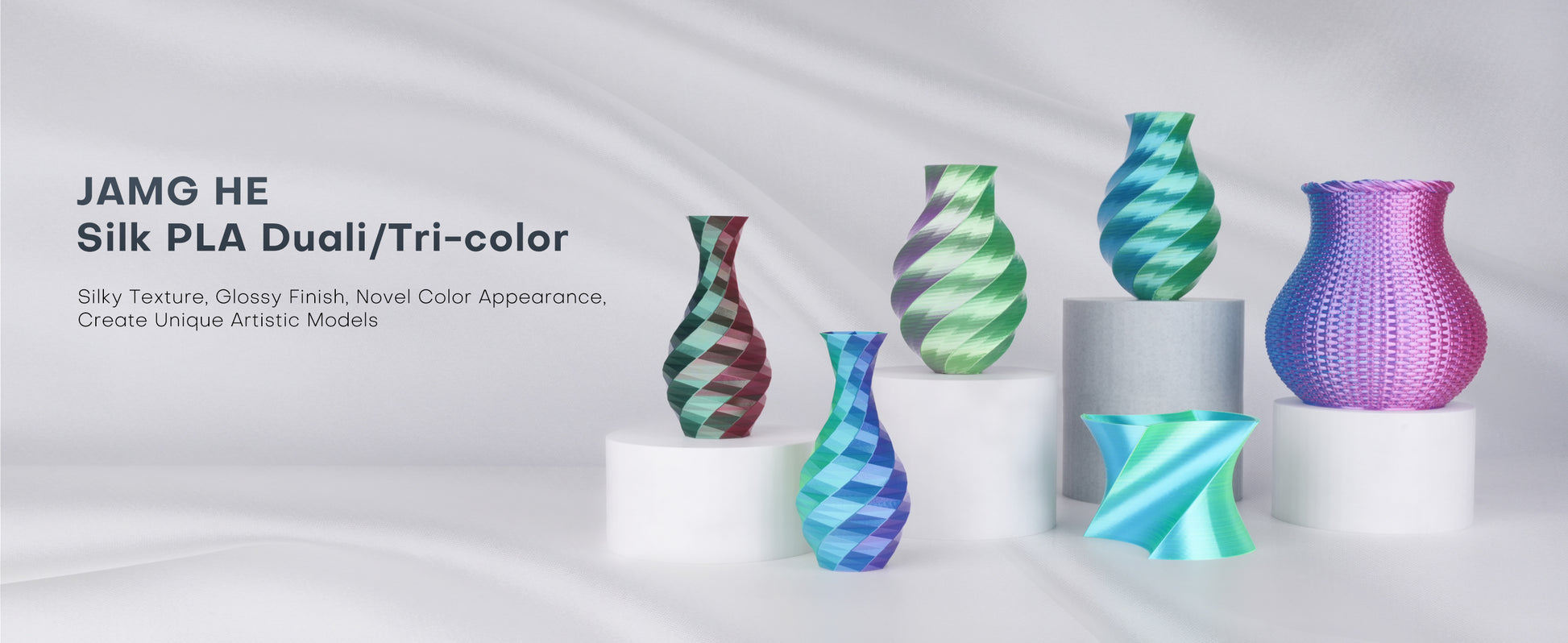 Elevate your 3D printing projects with JAMG HE's Dual Color PLA Filament, available at Jupiter Landing. This innovative filament prints two colors in a single strand, bringing your creations to life with stunning, vivid gradient colors and a luxurious silk-like surface. Here's why you should consider adding it to your 3D printing arsenal: